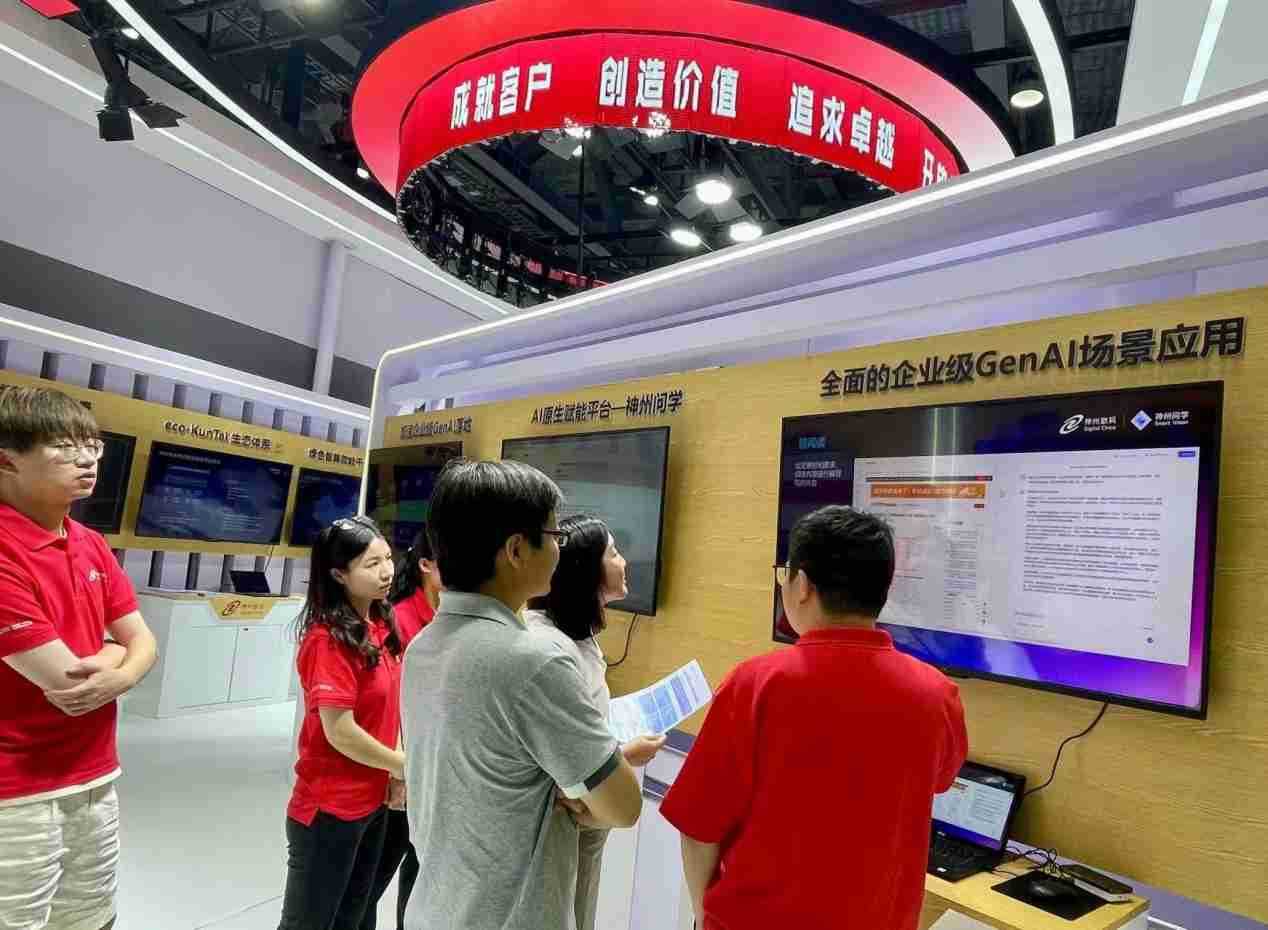 现场展示了企业级AI原生赋能平台迪拜皇宫问学,,打通GenAl落地企业的算力、、、、模型、、、知识、、、、应用四大要素,,,,综合解决GenAI工程在选、、、练、、、用、、、管四大环节的问题,,,旨在为企业的数智化转型提供全套的GenAl智能应用工程流水线。。。。