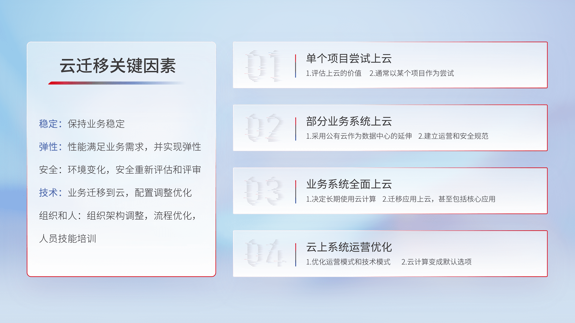 结合实际业务,,,从规划设计、、云平台选型、、云原生改造、、、、数据迁移、、、、集成交付,,,迁移全过程为客户识别最佳上云路径,,做好风险识别管理,,,设计网络架构、、、身份权限、、、、安全审计合规、、操作审计、、、日志审计、、、监控告警策略、、多站点容灾设计等,,对云上基础设施进行整体规划,,,,提升IT治理水平,,,,以满足弹性、、高可用、、、、高性能的需求。。
